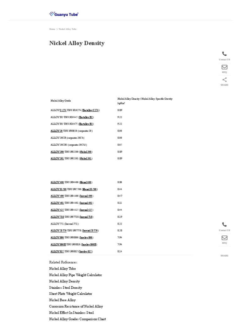 Nickel Alloy Density / Nickel Alloy Specific Gravity