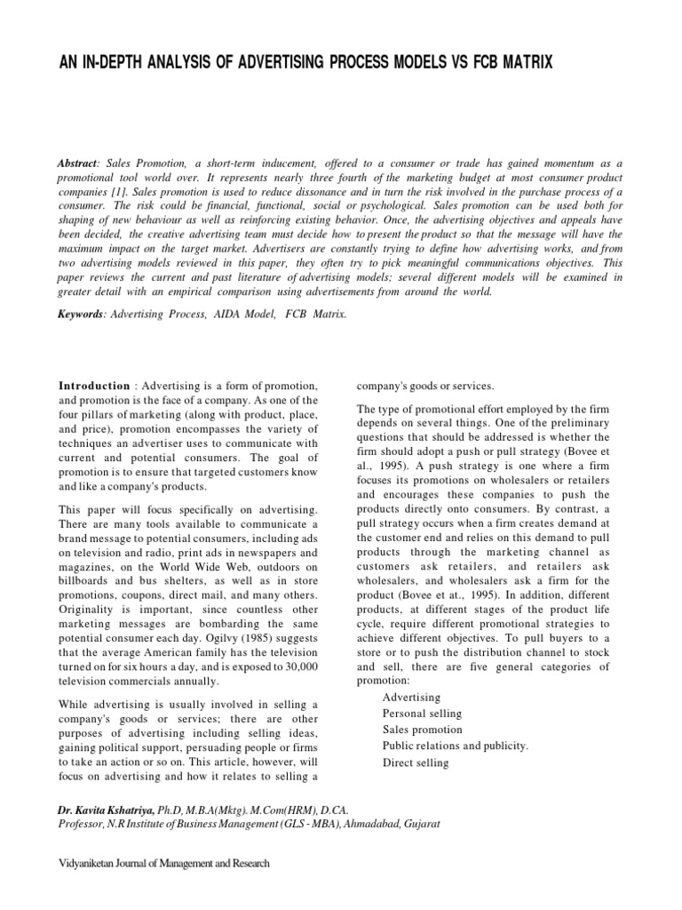 Keywords: Advertising Process, AIDA Model, FCB Matrix.