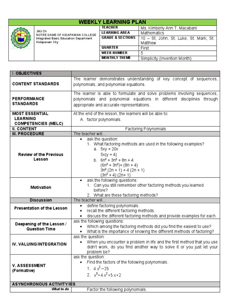 NOTRE DAME OF KIDAPAWAN COLLEGE Mathematics