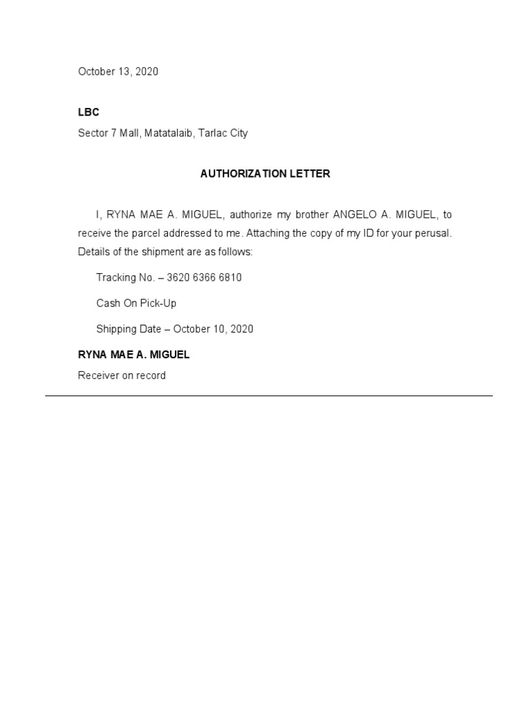 I, RYNA MAE A. MIGUEL, authorize my brother ANGELO A. MIGUEL, to