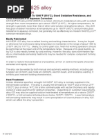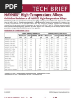 The document discusses the creep and rupture properties, thermal stability, oxidation resistance, and properties after thermal exposure of Haynes International's HAYNES® 625 alloy. It provides data on stress to produce 1% creep in 1000 hours and phase precipitation upon long-term exposure at intermediate temperatures. Tables of test results are given for oxidation resistance, dynamic oxidation, and oxidation resistance in air with 10% water vapor.