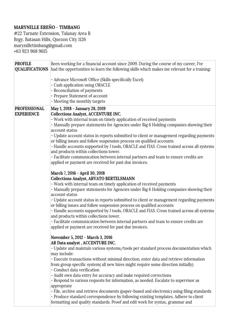 EXPERIENCE Collections Analyst, ACCENTURE INC.
