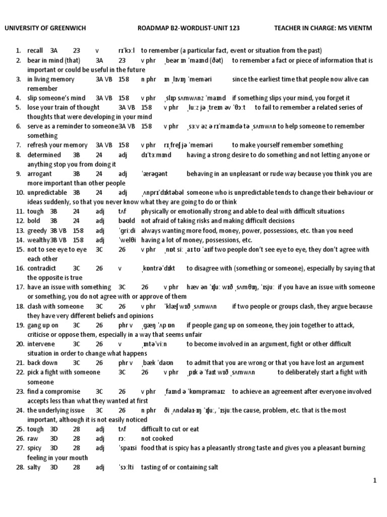 UNIVERSITY OF GREENWICH ROADMAP B2-WORDLIST-UNIT 123 TEACHER IN CHARGE: MS VIENTM