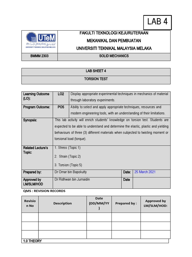 Synopsis: This lab activity will enrich students’ knowledge on torsion test. Students are