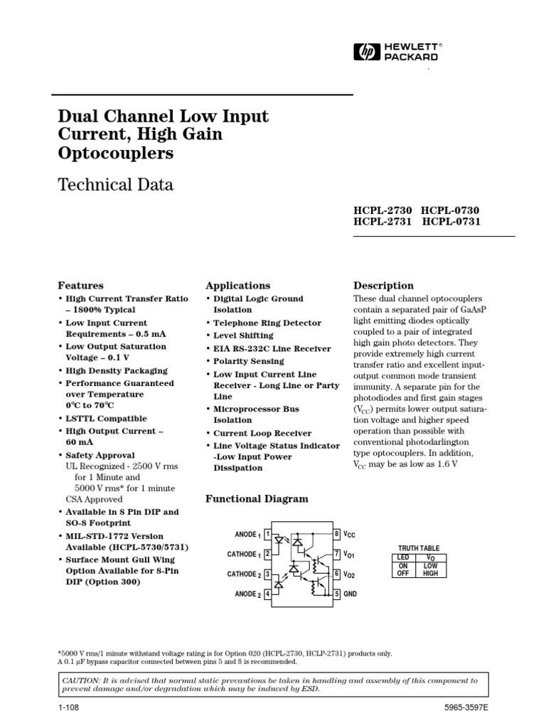 Dual Channel Low Input Current, High Gain Optocouplers: HCPL-2730 HCPL-0730 HCPL-2731 HCPL-0731