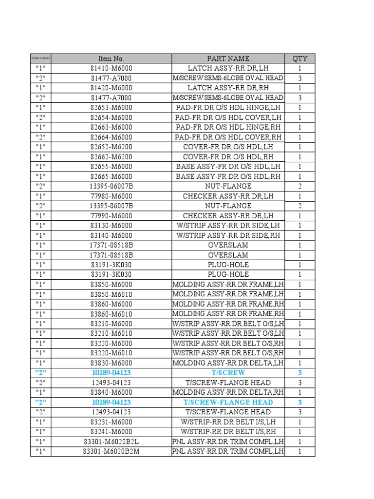 Item No. PART NAME QTY