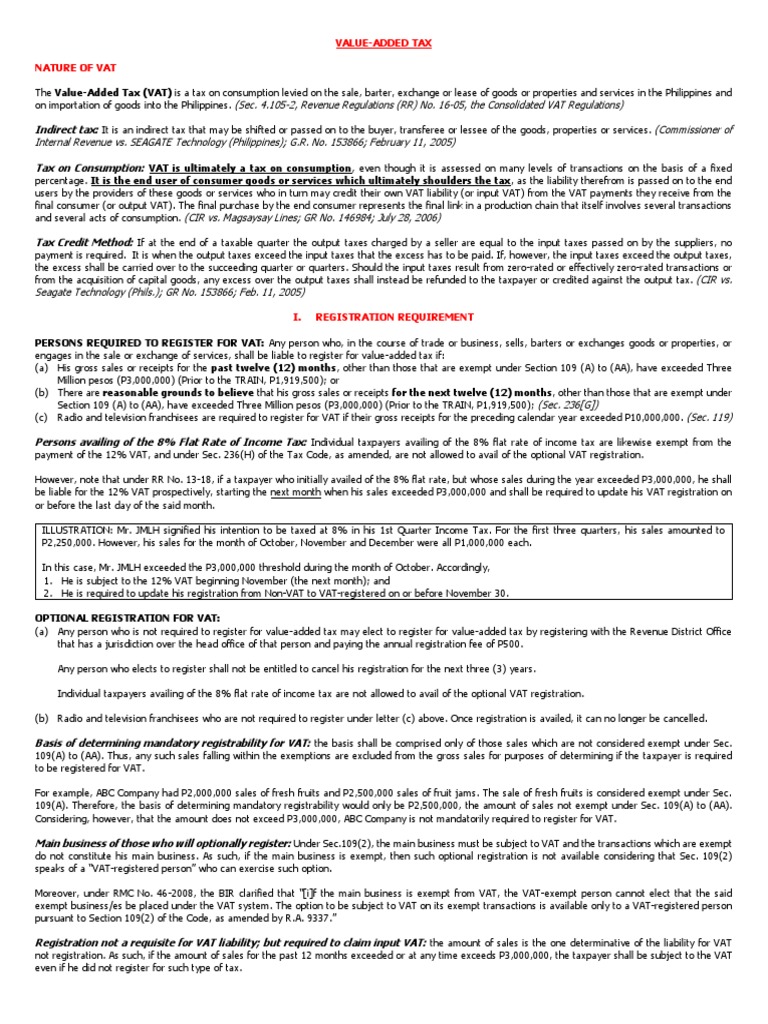 The Value-Added Tax (VAT) is a tax on consumption levied on the sale, barter, exchange or lease of goods or properties and services in the Philippines and