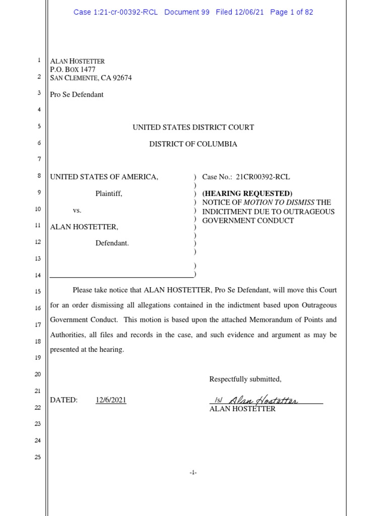 THE INDICITMENT DUE TO OUTRAGEOUS GOVERNMENT CONDUCT ) Please take notice that ALAN HOSTETTER, Pro Se Defendant, will move this Court for an order dismissing all allegations contained in the indictment based upon Outrageous Government Conduct. This motion is based upon the attached Memorandum of Points and Authorities, all files and records in the case, and such evidence and argument as may be presented at the hearing. Respectfully submitted, DATED: 12/6/2021 /s/ ALAN HOSTETTER