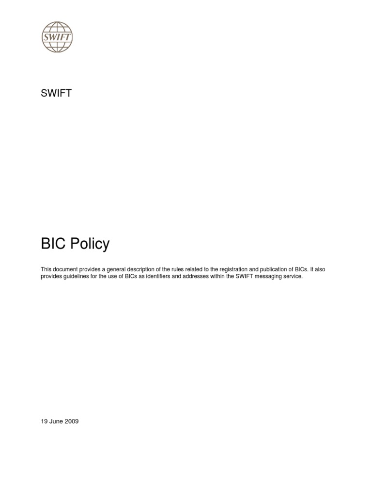 provides guidelines for the use of BICs as identifiers and addresses within the SWIFT messaging service.