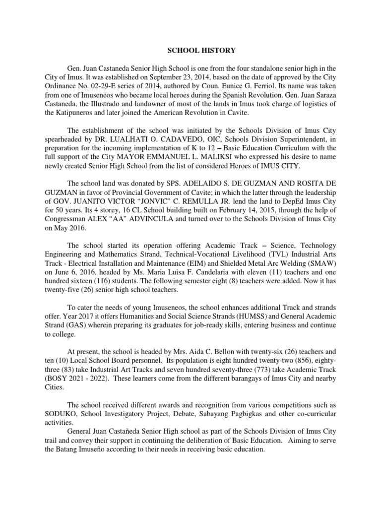 General Juan Castañeda Senior High school as part of the Schools Division of Imus City