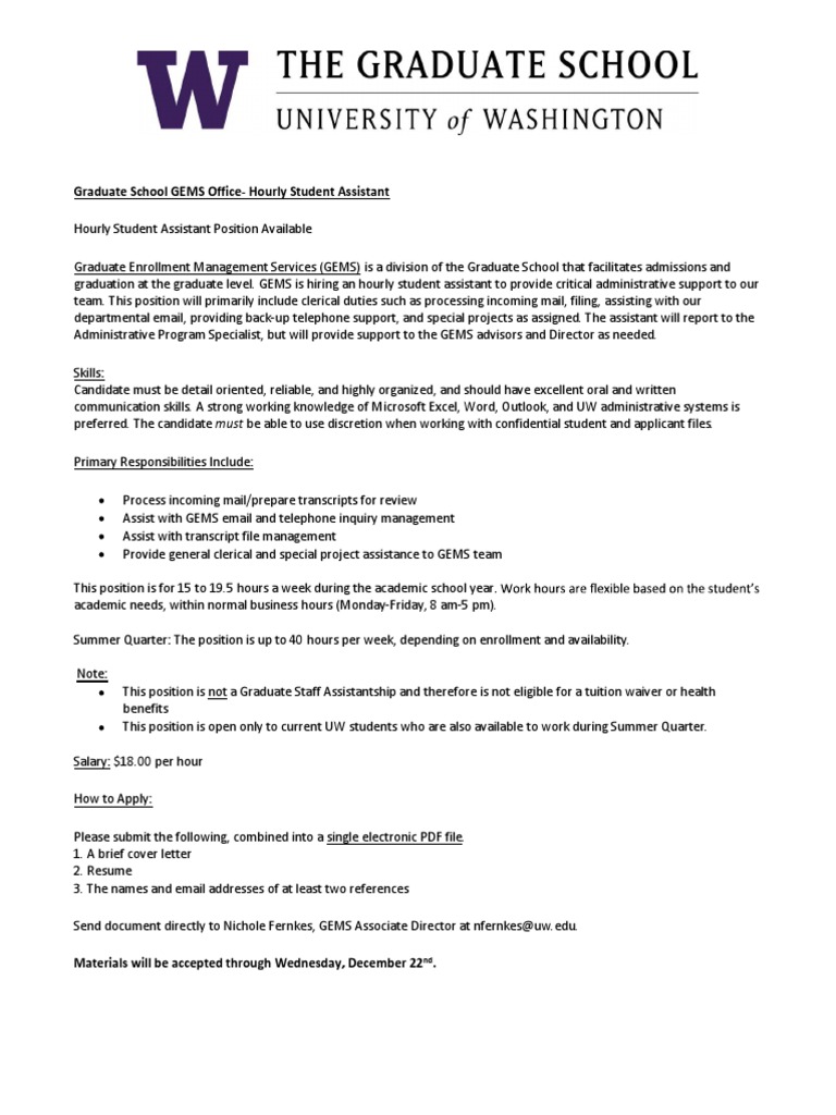 graduation at the graduate level. GEMS is hiring an hourly student assistant to provide critical administrative support to our