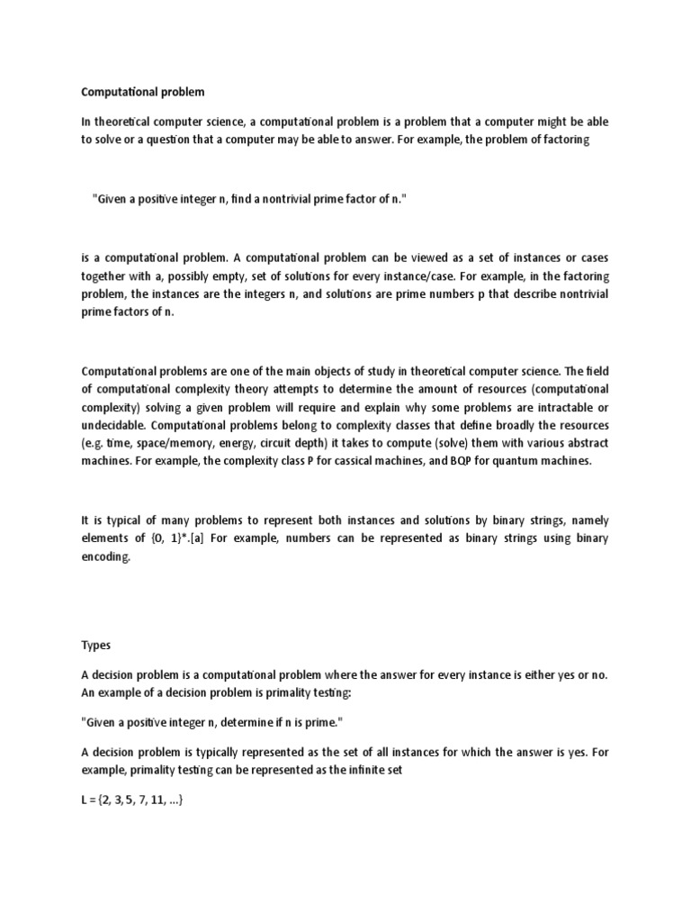 to solve or a question that a computer may be able to answer. For example, the problem of factoring