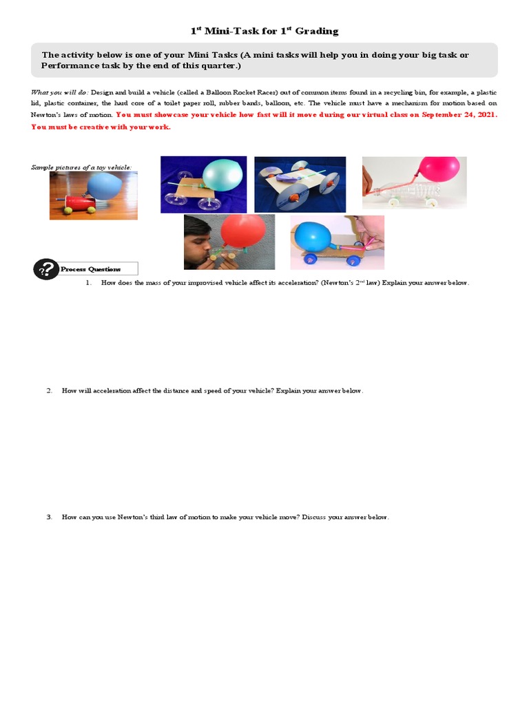 Newton’s laws of motion. You must showcase your vehicle how fast will it move during our virtual class on September 24, 2021.