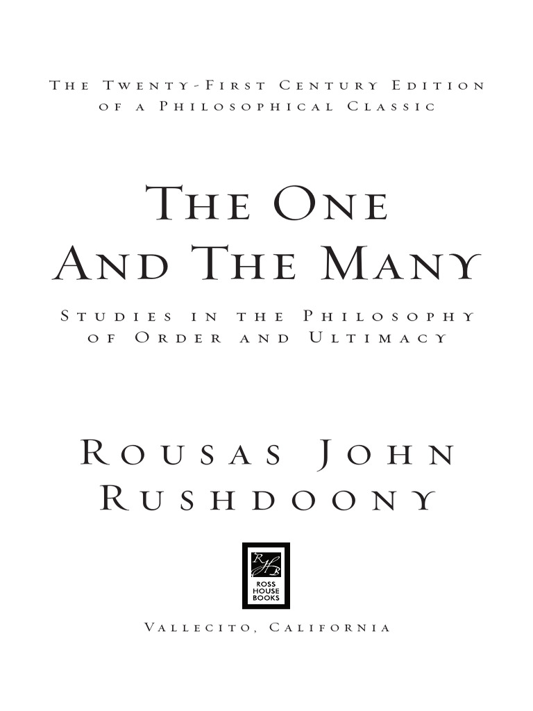 copyright 1971, 2007Mark R. Rushdoony Chalcedon / Ross House BooksPO Box 158Vallecito, CA 95251 www.rosshousebooks.org All rights reserved.No part of this book may be reproduced, stored in a retrieval system, or transmitted in any form or by any means — electronic, mechanical, photocopy, recording, or otherwise — except for brief quotations for the purpose of review or comment, without the prior written permission of the publisher.Library of Congress Catalog Card Number: 2006926982ISBN: 978-1-879998-46-9