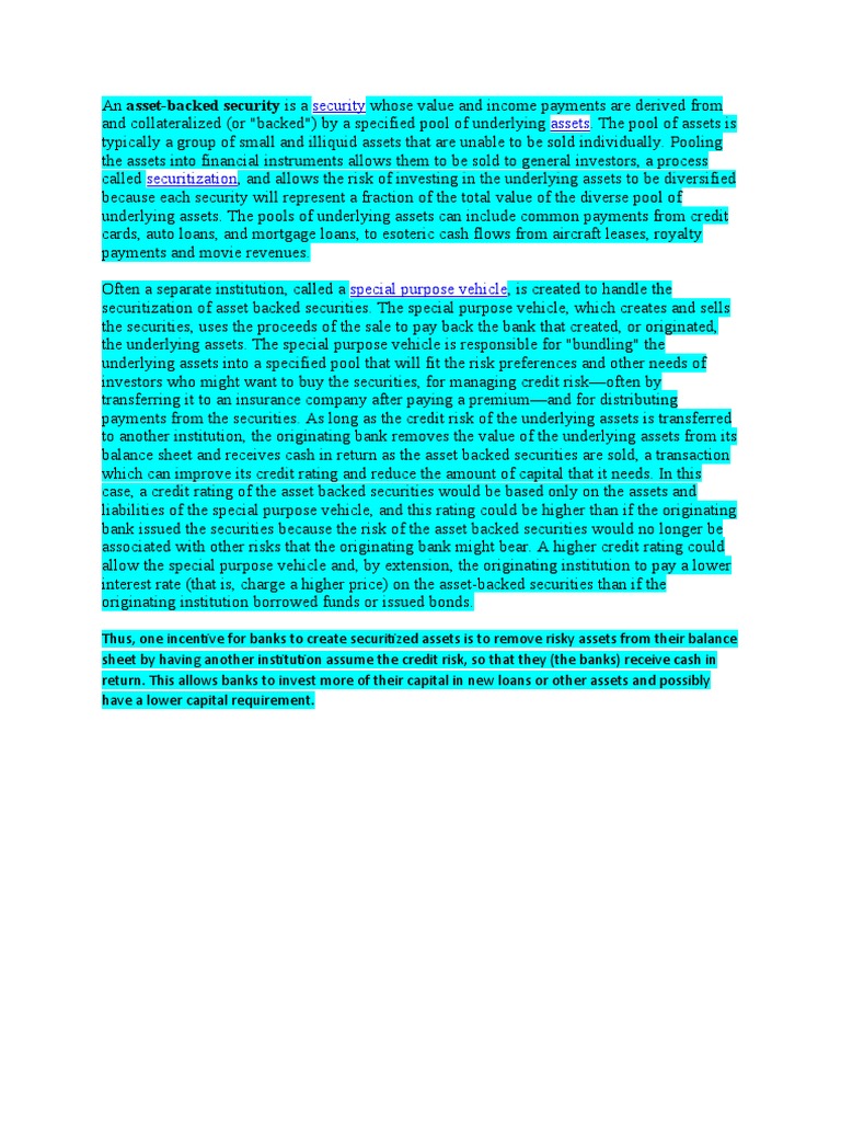Thus, one incentive for banks to create securitized assets is to remove risky assets from their balance