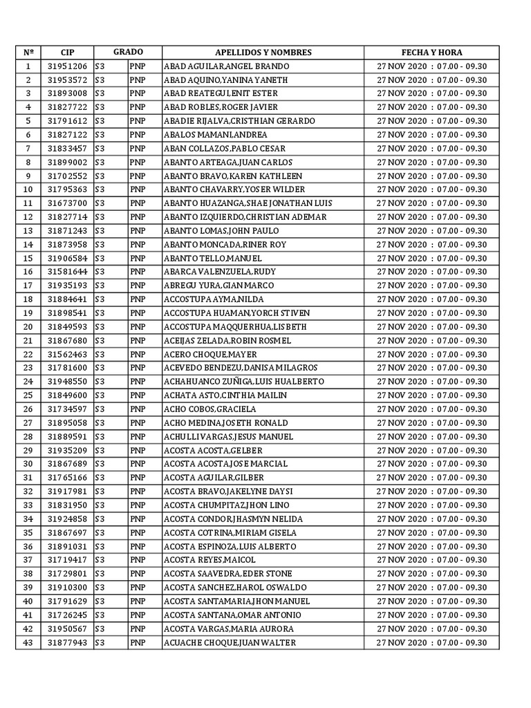 Nº CIP GRADO APELLIDOS Y NOMBRES FECHA Y HORA