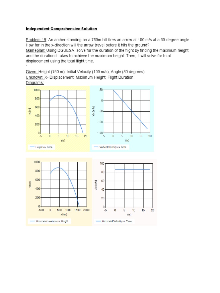 Problem 19: An archer standing on a 750m hill fires an arrow at 100 m/s at a 30-degree angle.