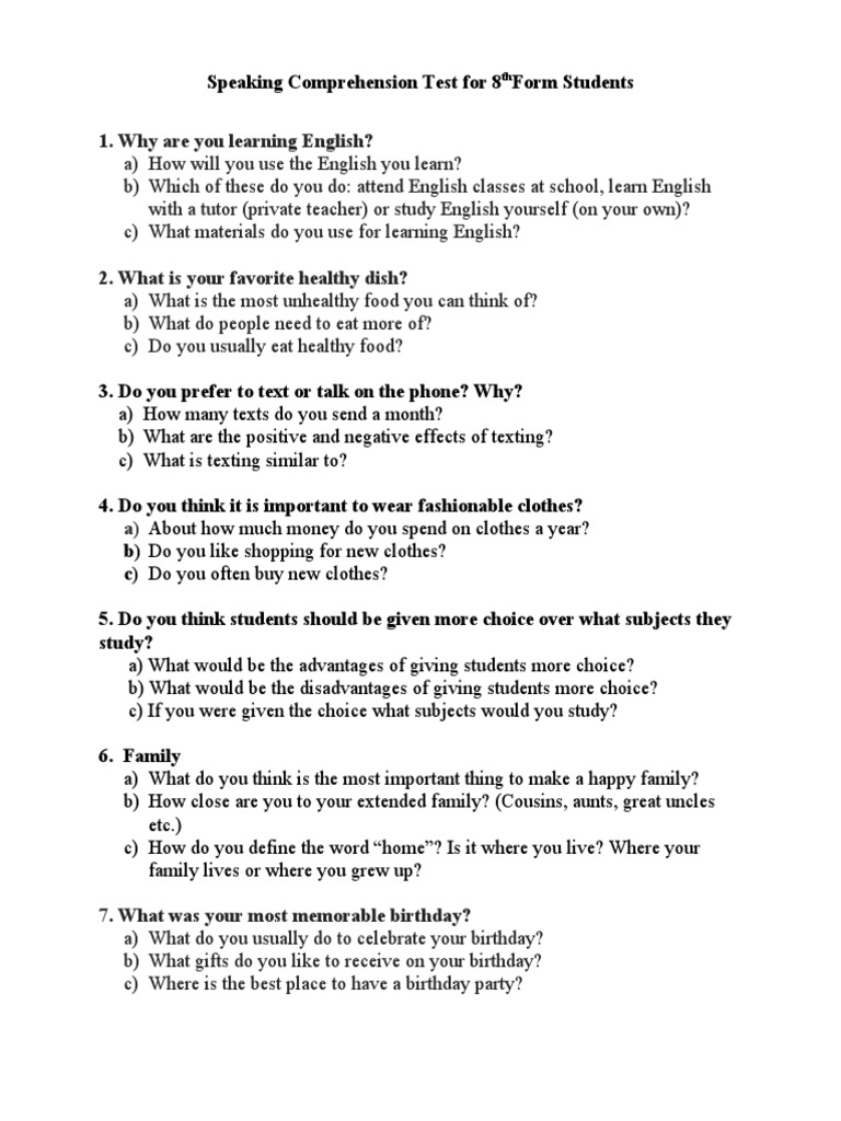 Speaking Comprehension Test for 8thForm Students