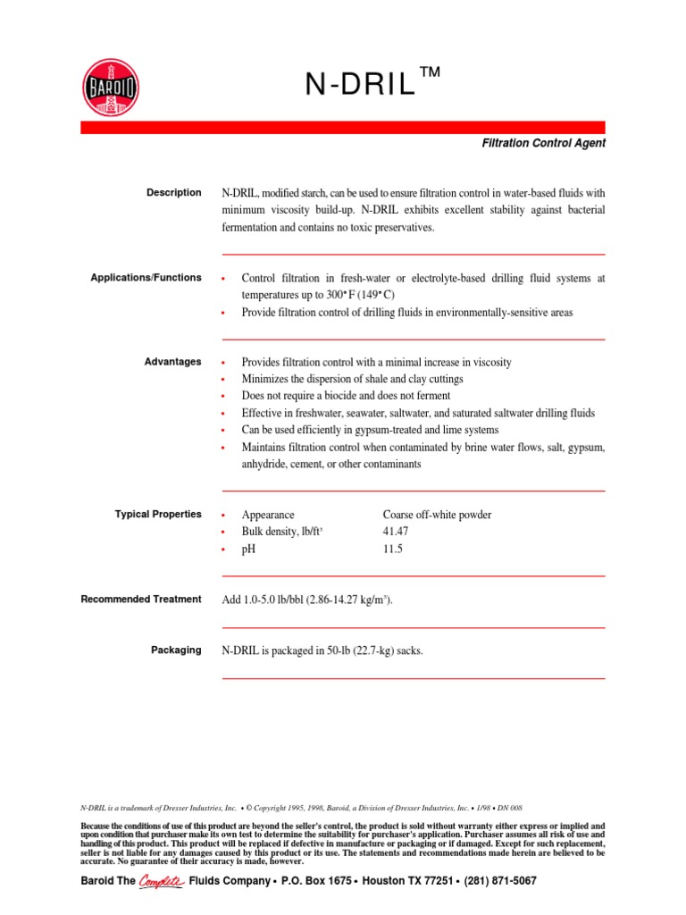 N-DRIL is a trademark of Dresser Industries, Inc. C © Copyright 1995, 1998, Baroid, a Division of Dresser Industries, Inc. C 1/98 C DN 008