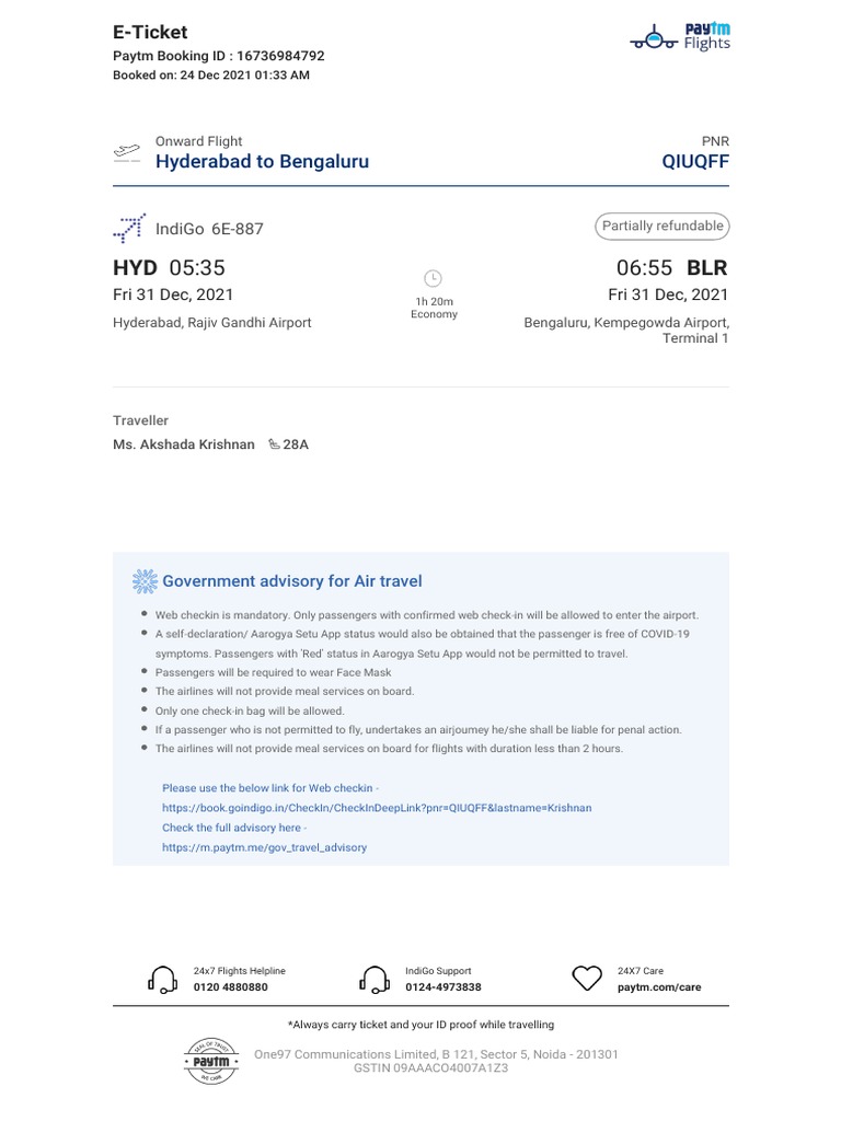 Please carry your Government ID proof for all passengers to show during security check and check-in. Name