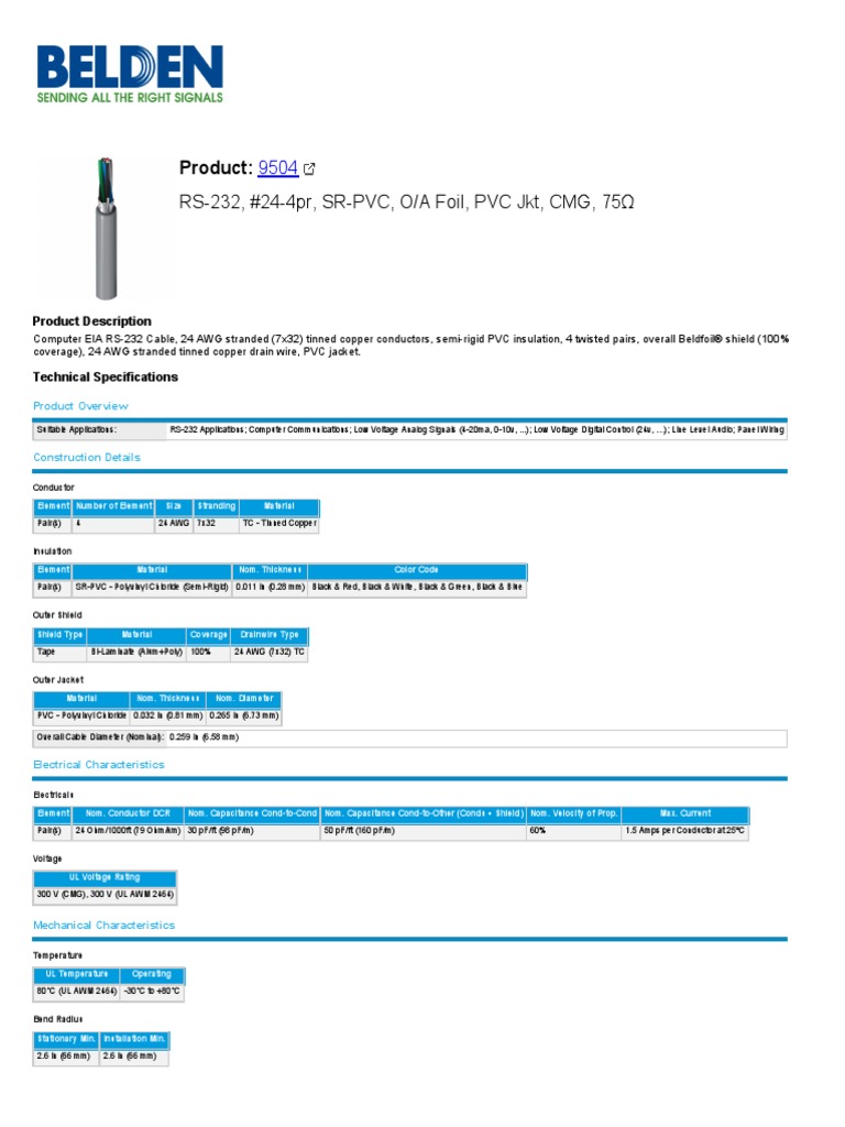 Computer EIA RS-232 Cable, 24 AWG stranded (7x32) tinned copper conductors, semi-rigid PVC insulation, 4 twisted pairs, overall Beldfoil® shield (100%