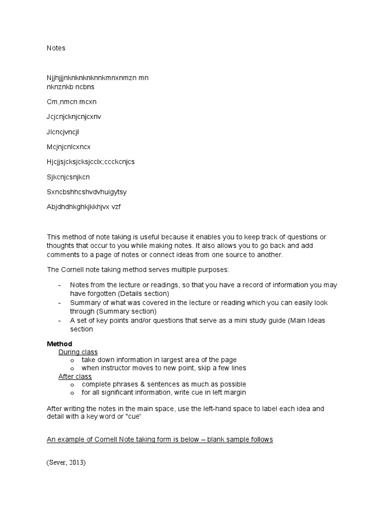 An example of Cornell Note taking form is below – blank sample follows