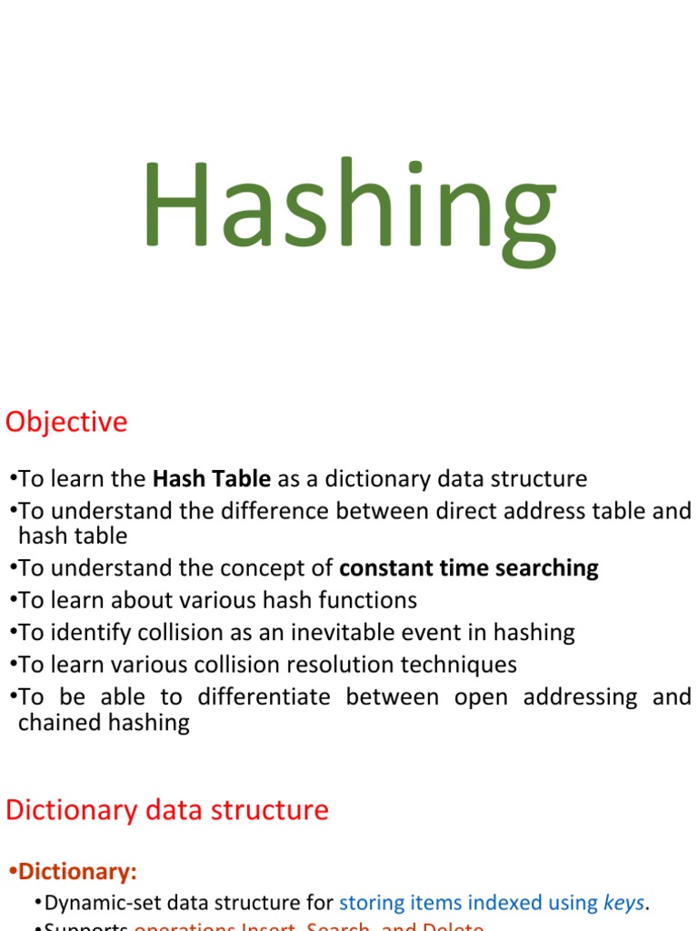 – Separate chaining (Open Hashing) Hash function h to map keys to