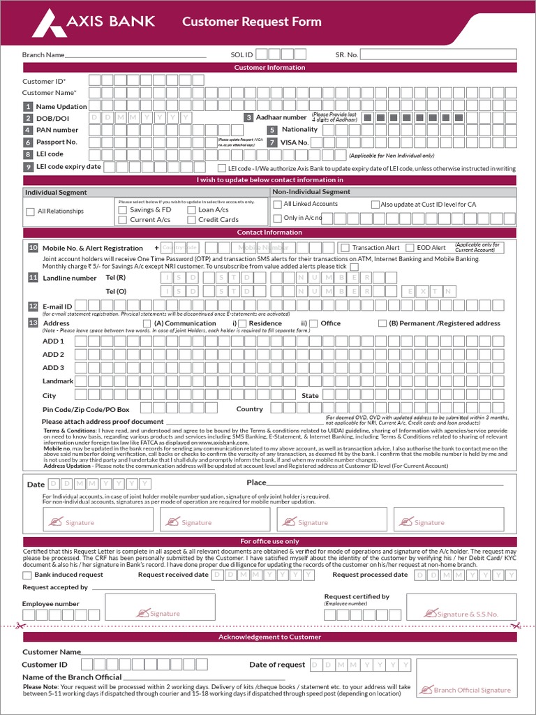 Address Updation - Please note the communication address will be updated at account level and Registered address at Customer ID level (For Current Account)