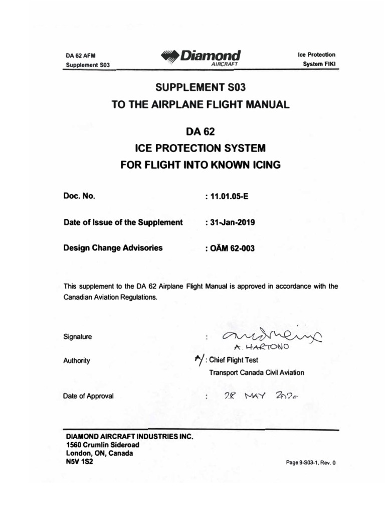 This supplement to the DA 62 Airplane Flight Manual is approved in accordance with the