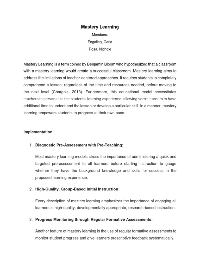 with a mastery learning would create a successful classroom. Mastery learning aims to