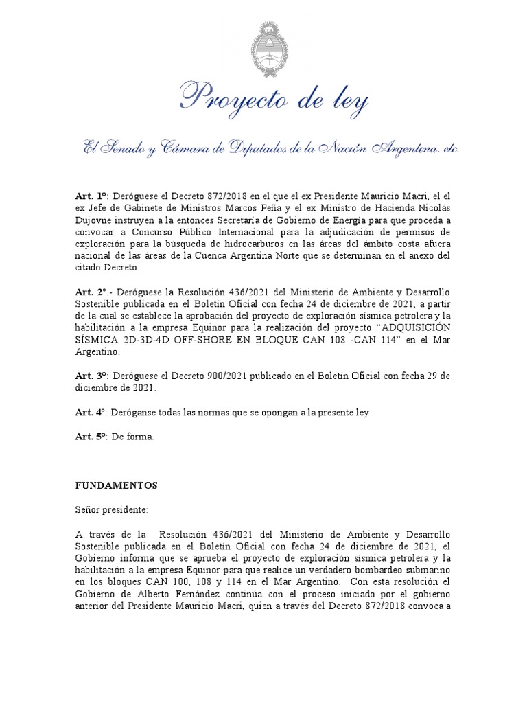 Señor presidente:A través de la Resolución 436/2021 del Ministerio de Ambiente y DesarrolloSostenible publicada en el Boletín Oficial con fecha 24 de diciembre de 2021, elGobierno informa que se aprueba el proyecto de exploración sísmica petrolera y lahabilitación a la empresa Equinor para que realice un verdadero bombardeo submarinoen los bloques CAN 100, 108 y 114 en el Mar Argentino. Con esta resolución elGobierno de Alberto Fernández continúa con el proceso iniciado por el gobiernoanterior del Presidente Mauricio Macri, quien a través del Decreto 872/2018 convoca a