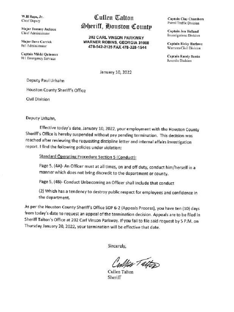 ‘As per the Houston County Sheriff's Office SOP 6-2 (Appeals Process}, you have ten (10) days.