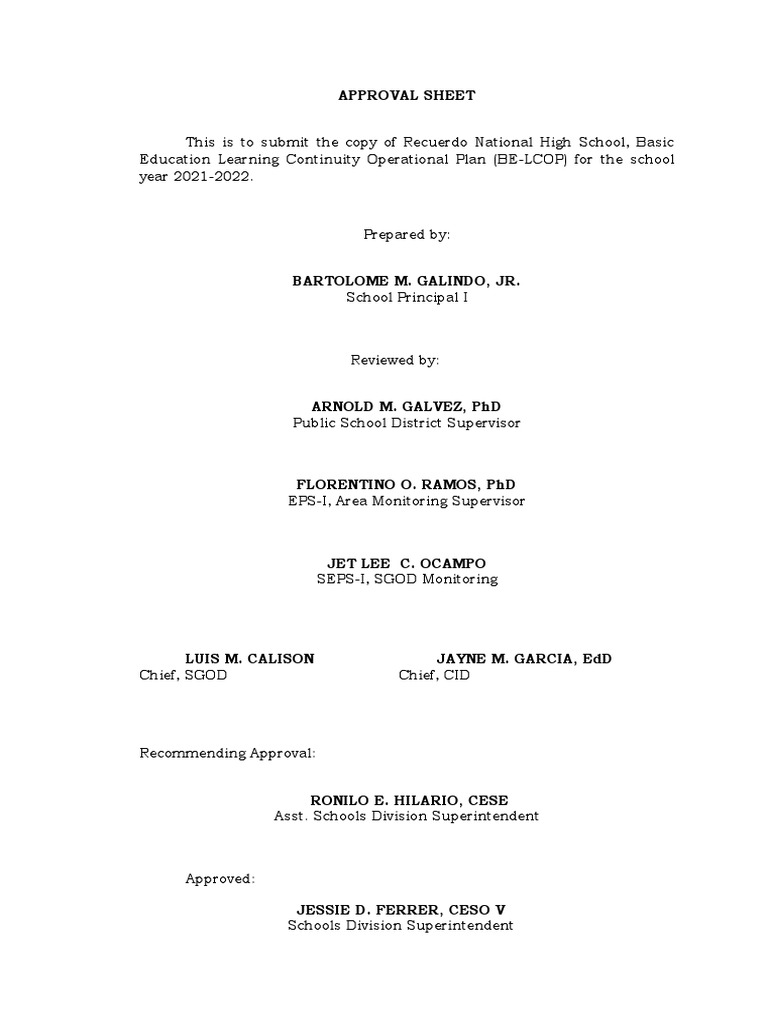 Education Learning Continuity Operational Plan (BE-LCOP) for the school