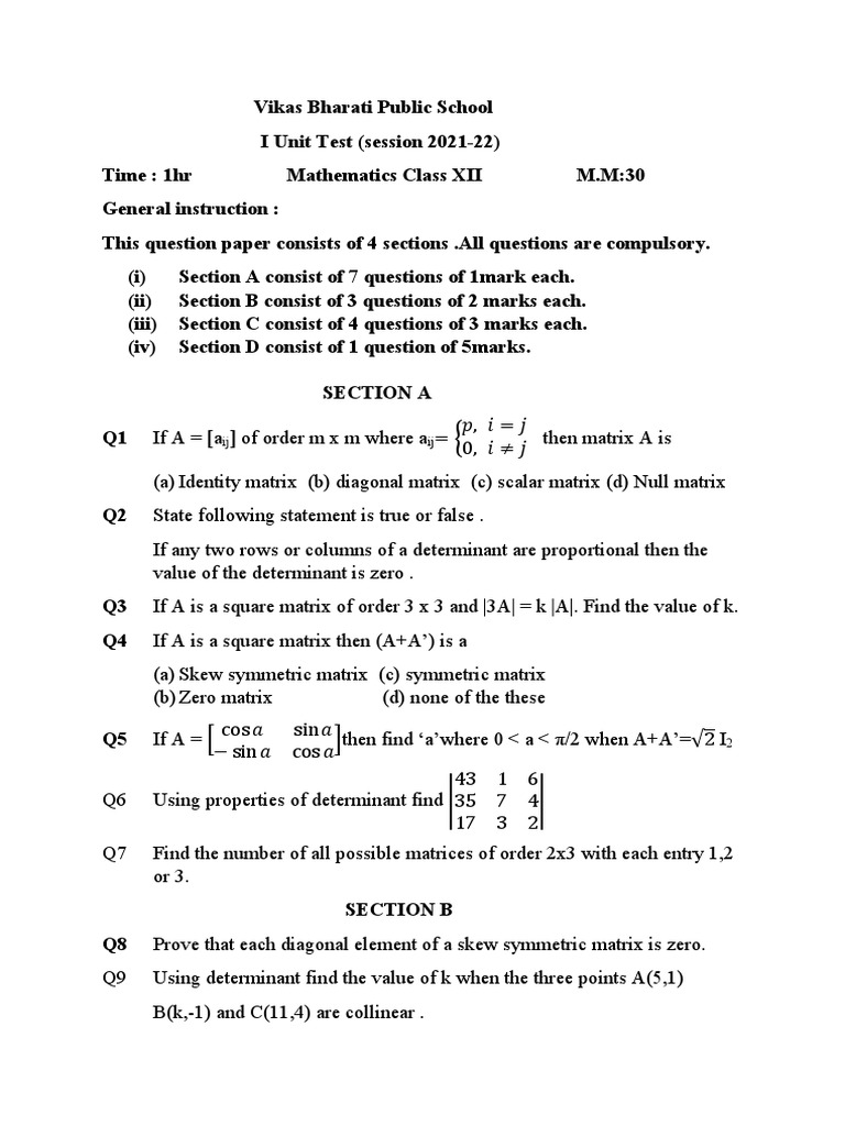 Q1 If A = [aij] of order m x m where aij= then matrix A is