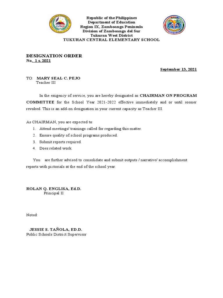 In the exigency of service, you are hereby designated as SCHOOL-BASED FEEDING