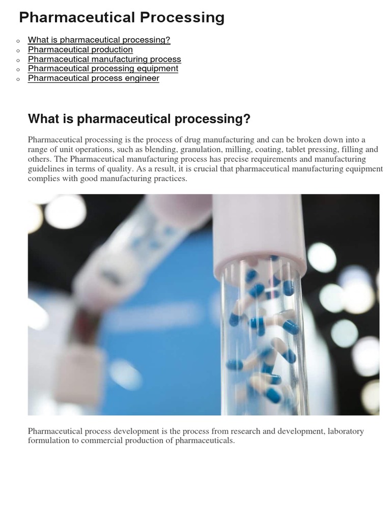 Pharmaceutical processing is the process of drug manufacturing and can be broken down into a