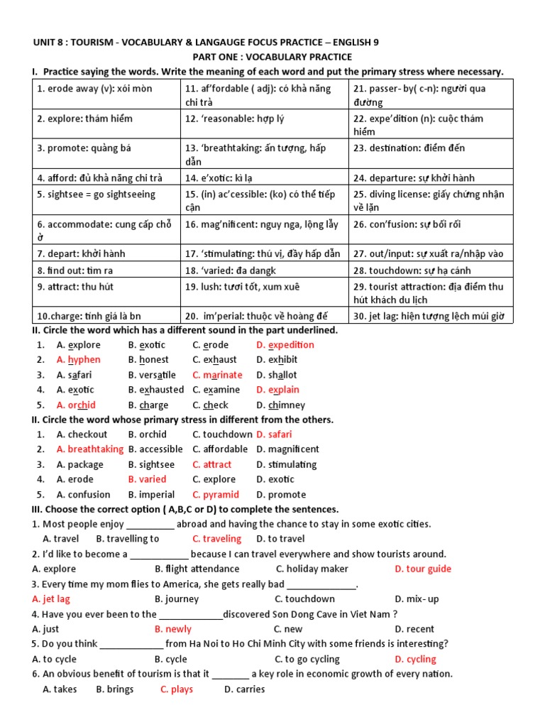 UNIT 8 : TOURISM - VOCABULARY & LANGAUGE FOCUS PRACTICE – ENGLISH 9