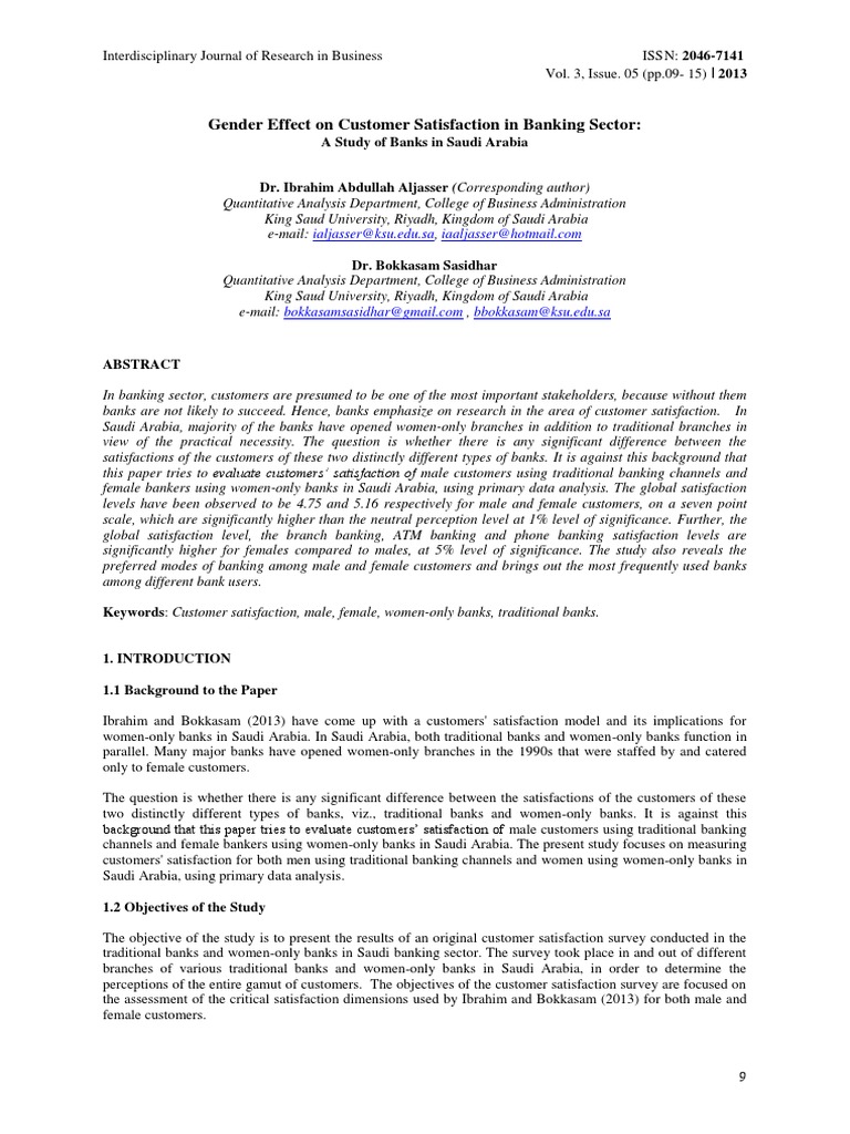 customer satisfaction. It is very important for banks to understand potential gender effects on customers'