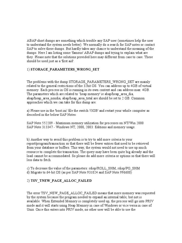 ABAP short dumps are something which trouble any SAP user. Here I am listing some 'famous' abap dumps and trying to explain what are they. Problems with the dump STORAGE_PARAMETERS_WRONG_SET are mainly related to the general restrictions of the 32bit OS.