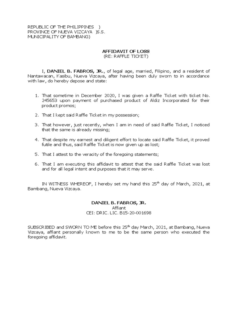6. That I am executing this affidavit to attest that the said Raffle Ticket was lost