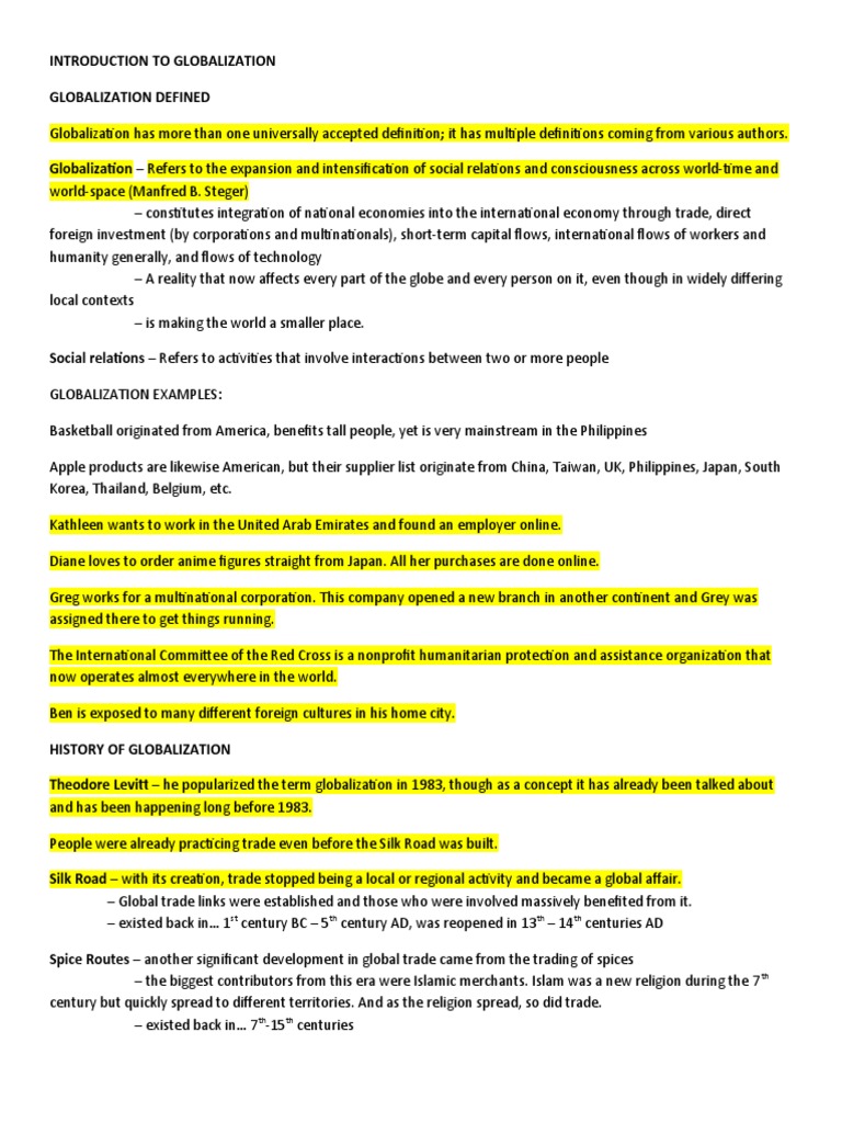 Globalization – Refers to the expansion and intensification of social relations and consciousness across world-time and