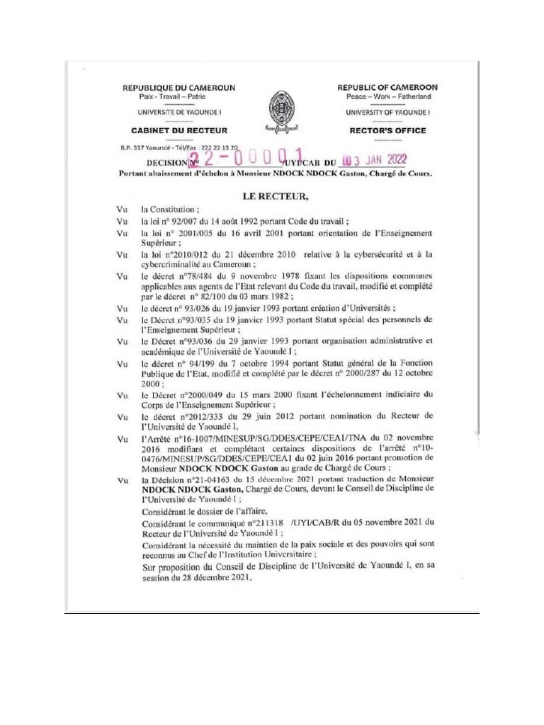 Sur proposition du Conseil de Discipline de l'Université de Yaoundé 1, en sa
