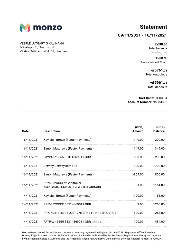 16/11/2021 PAYPAL *B365 35314369011 GBR -500.00 200.00