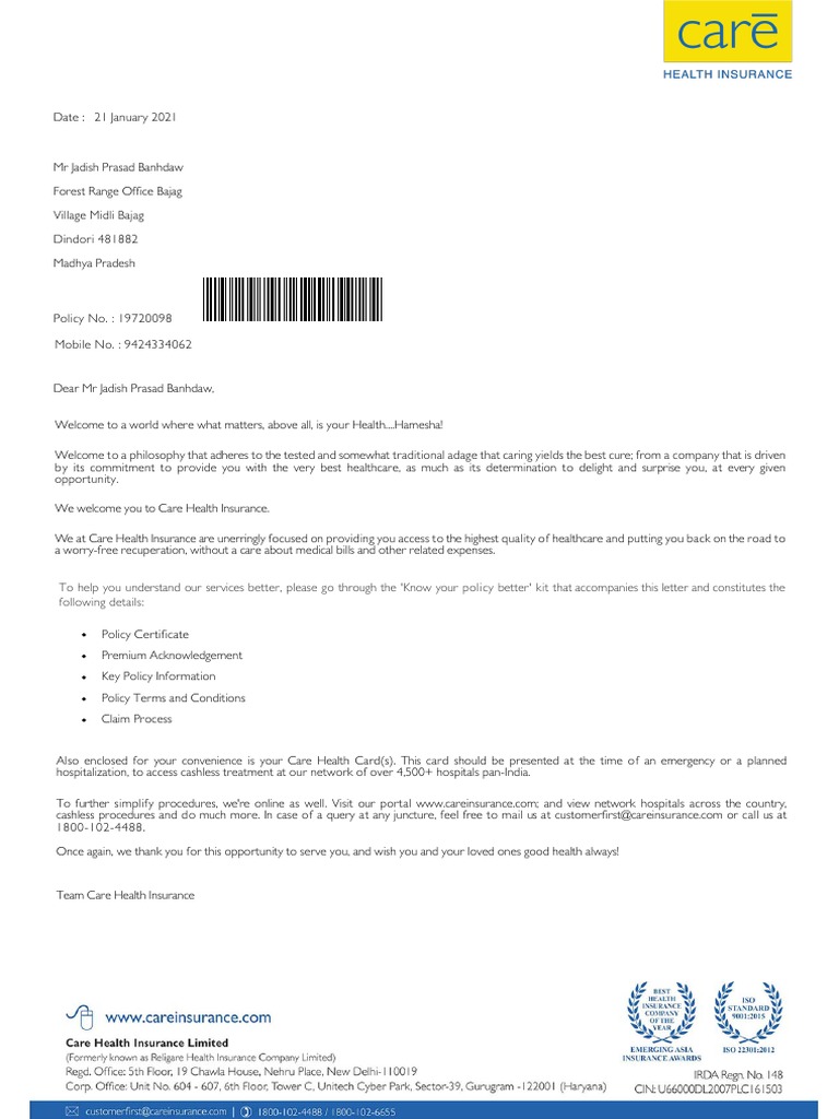 In reference to your online proposal (1120017459797) for 'Care'- Comprehensive Health Insurance policy, please find below the details as provided