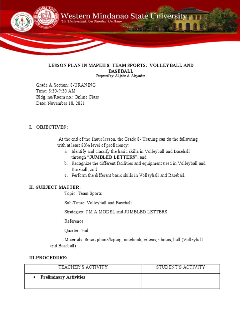 LESSON PLAN IN MAPEH 8: TEAM SPORTS: VOLLEYBALL AND