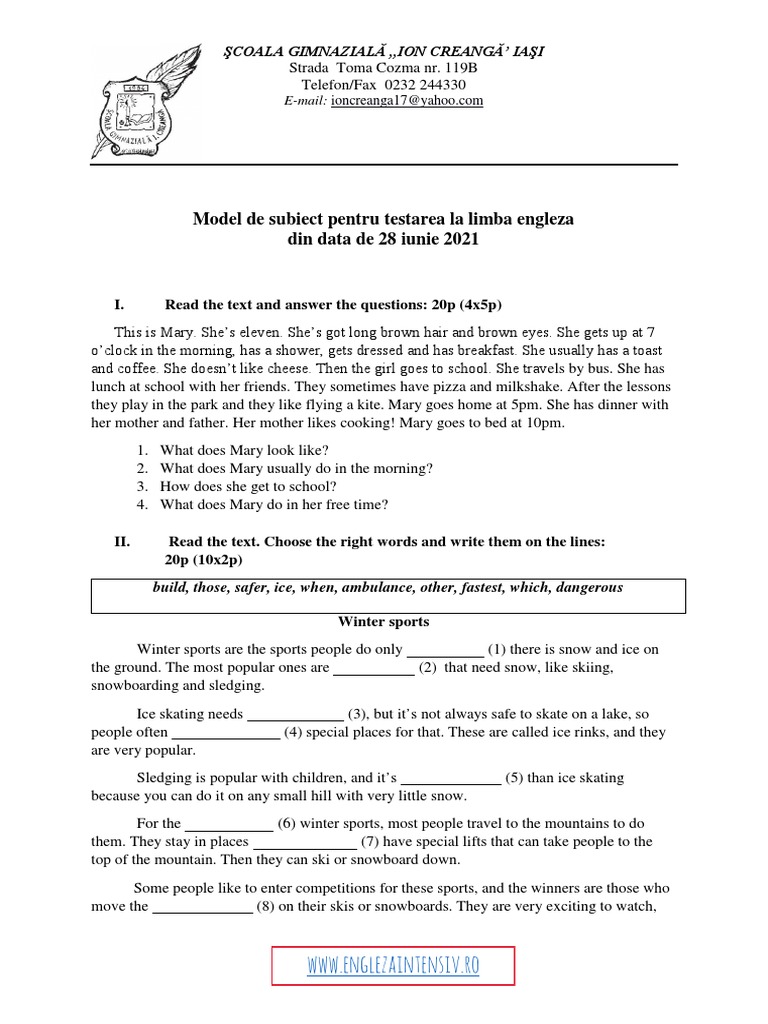 Model de subiect pentru testarea la limba engleza