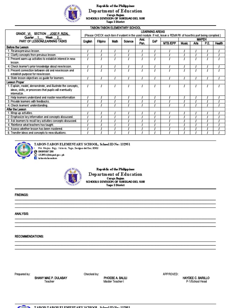 PART OF LESSON/LEARNING TASKS English Filipino Math Science EsP