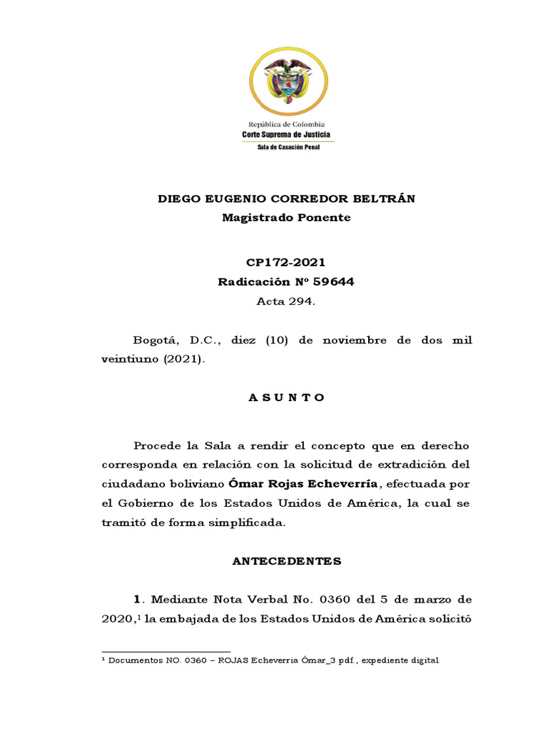Este documento presenta la solicitud de extradición del ciudadano boliviano Ómar Rojas Echeverría por parte de Estados Unidos. Rojas es requerido por delitos de tráfico de drogas ilícitas y delitos relacionados con armas de fuego. Colombia capturó a Rojas y ahora la Corte Suprema de Justicia debe decidir si aprueba la solicitud de extradición de acuerdo con los tratados internacionales vigentes entre los dos países. Las autoridades colombianas no tienen registros de procesos penales contra Rojas en Colombia.