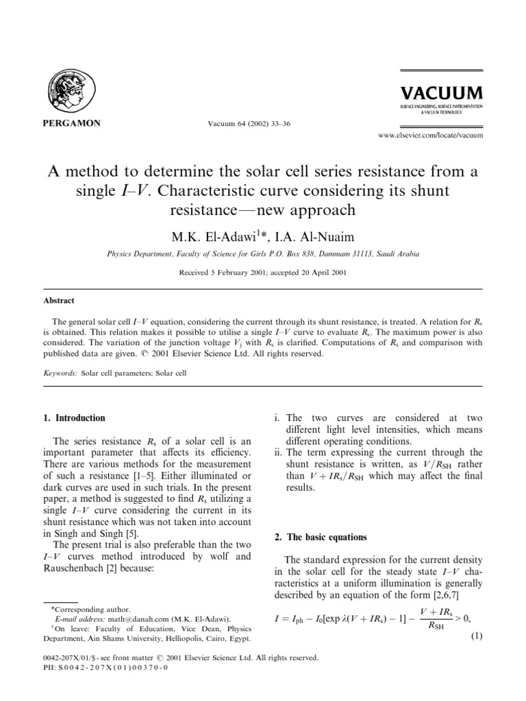E-mail address: math@[Link] (M.K. El-Adawi). I ¼ Iph I0 ½exp lðV þ IRs Þ 1 > 0;