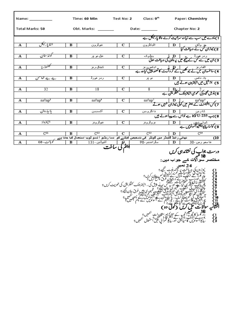 __________ Name: Time: 60 Min Test No: 2 Class: 9th Paper: Chemistry